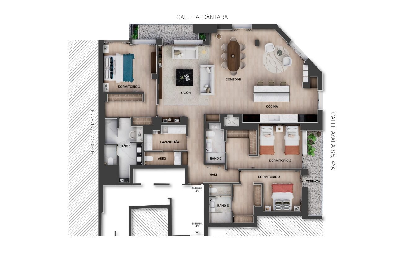 La distribución ofrece un amplio y luminoso salón-comedor , que aporta luz natural durante todo el día. Dispone de tres dormitorios y tres baños, además de un aseo adicional, proporcionando comodidad y privacidad. La cocina, totalmente equipada, se complementa con un práctico cuarto de lavado independiente.