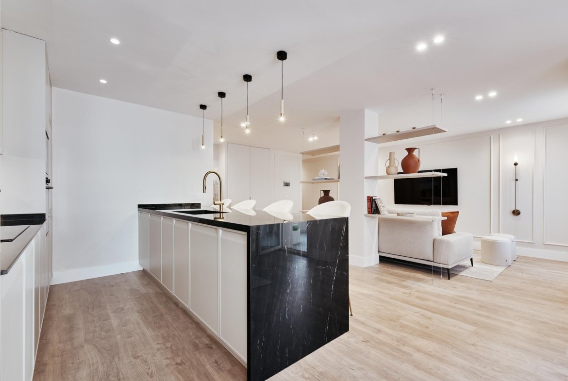 En Castelló 98, en el corazón del Barrio Salamanca, se encuentra esta vivienda exterior de 253 m2 catastrales, transformada íntegramente por el estudio ArcTempus, con una propuesta arquitectónica que refleja equilibrio, personalidad y una elegancia atemporal.