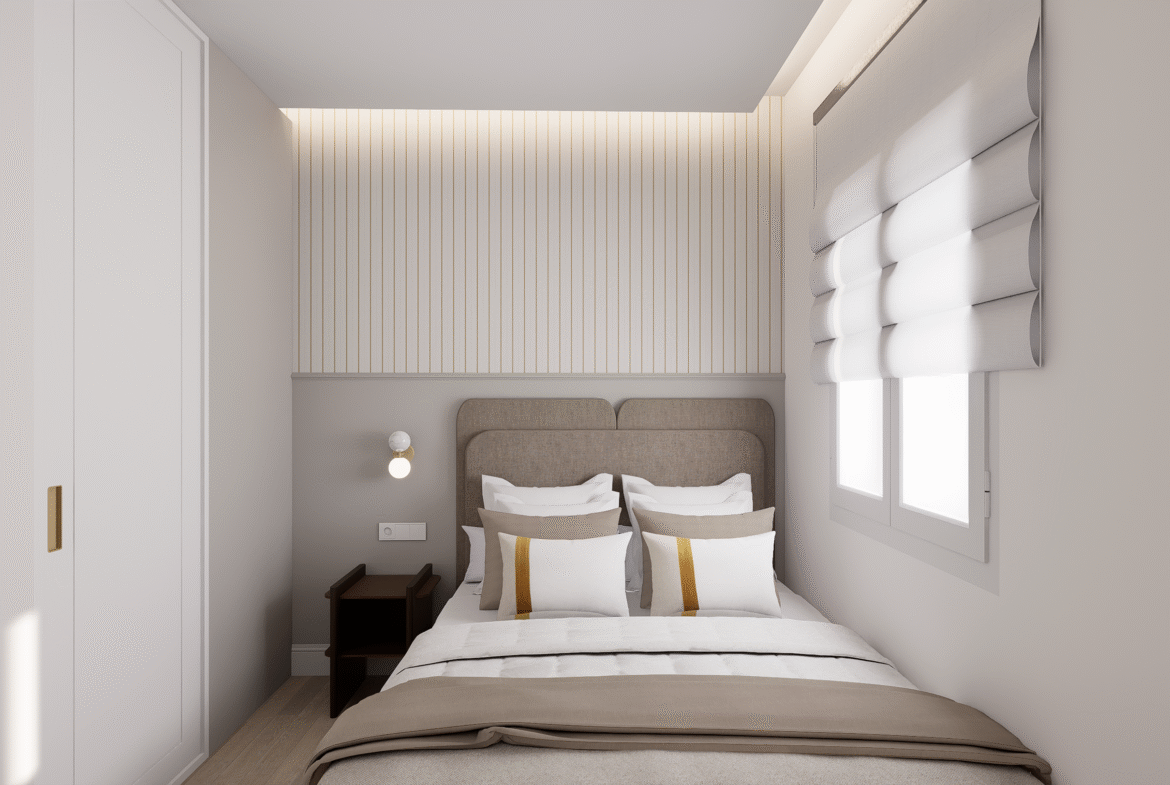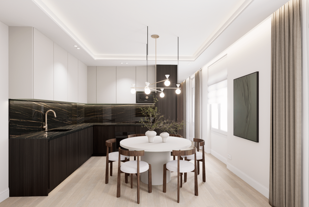 La propiedad, de carácter interior y orientación suroeste, ha sido transformada y se entrega completamente amueblada. El espacio principal combina salón, comedor y cocina equipada en un único ambiente, optimizando cada metro cuadrado y ofreciendo una sensación de equilibrio y confort.