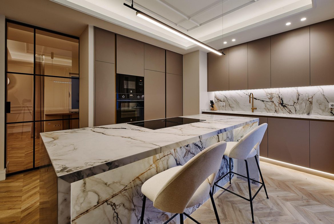 Los interiores reflejan la precisión y el estilo característicos de ArcTempus: carpintería de suelo a techo, materiales nobles, iluminación arquitectónica y una paleta cromática de tonos cálidos y neutros.
