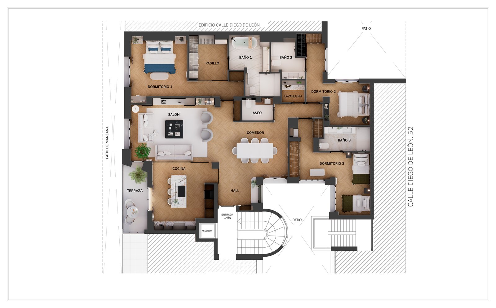 Ubicado en Diego de León 52, este tercer piso interior a patio de manzana ofrece la serenidad de los espacios tranquilos con la luminosidad característica de las fincas clásicas. Situado en el corazón de Lista – Salamanca, su entorno reúne la esencia más residencial del distrito con la cercanía a tiendas, restaurantes y zonas verdes.