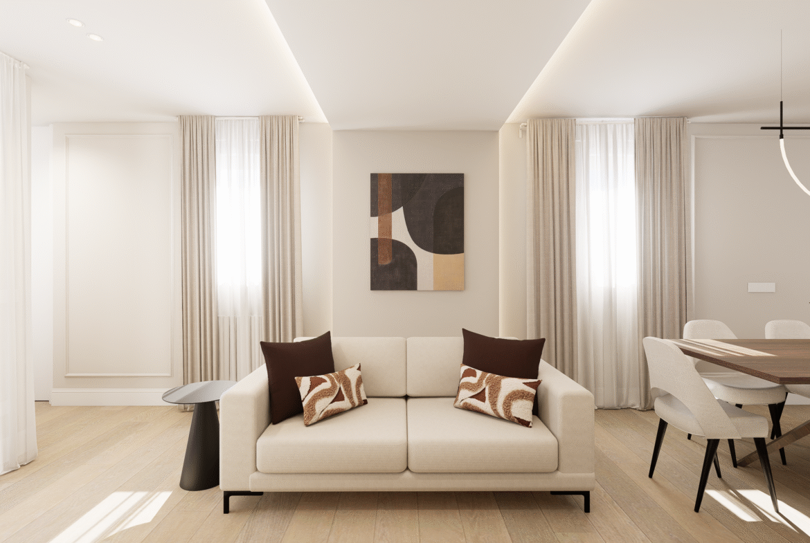 Una vivienda de 91 m2 catastrales situada en pleno Barrio de Salamanca, Goya 44, donde la arquitectura clásica madrileña se combina con una transformación contemporánea pensada para maximizar el confort y la funcionalidad.