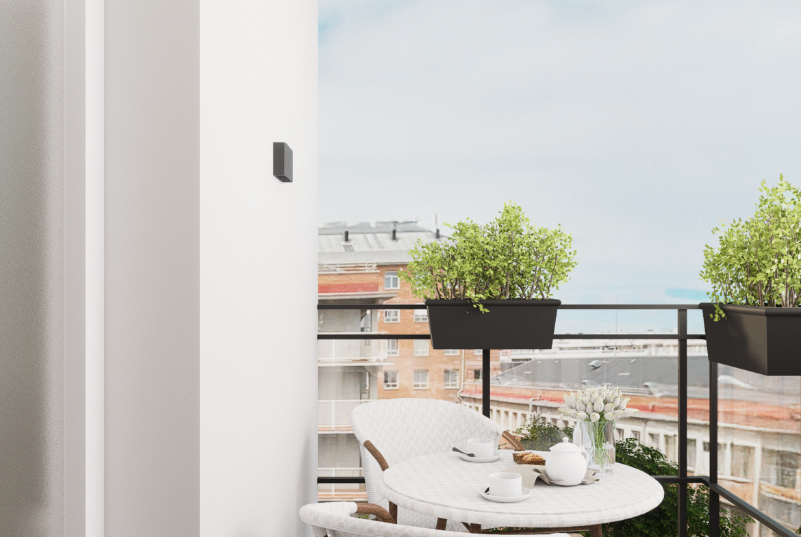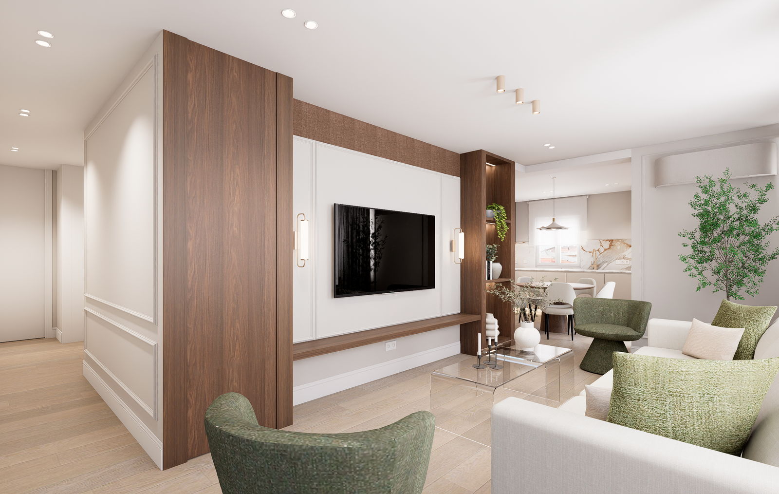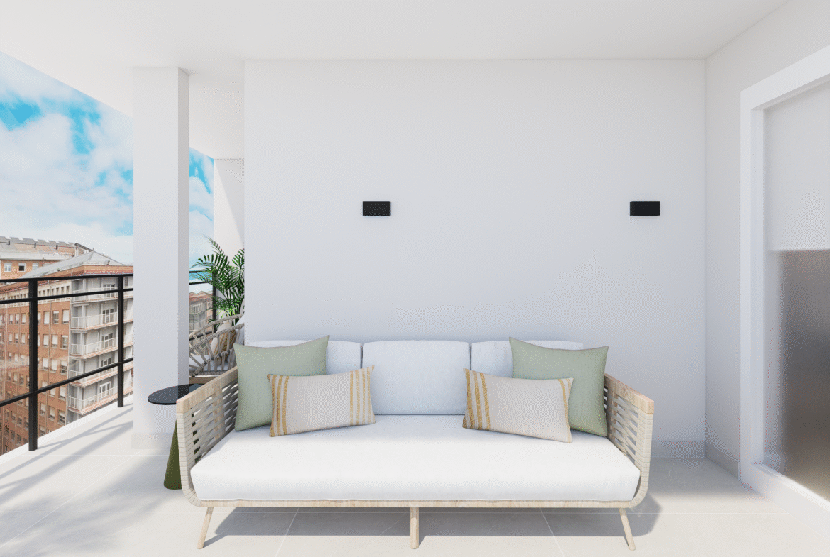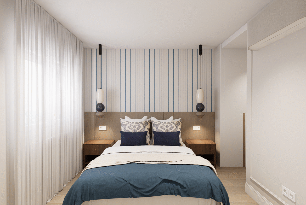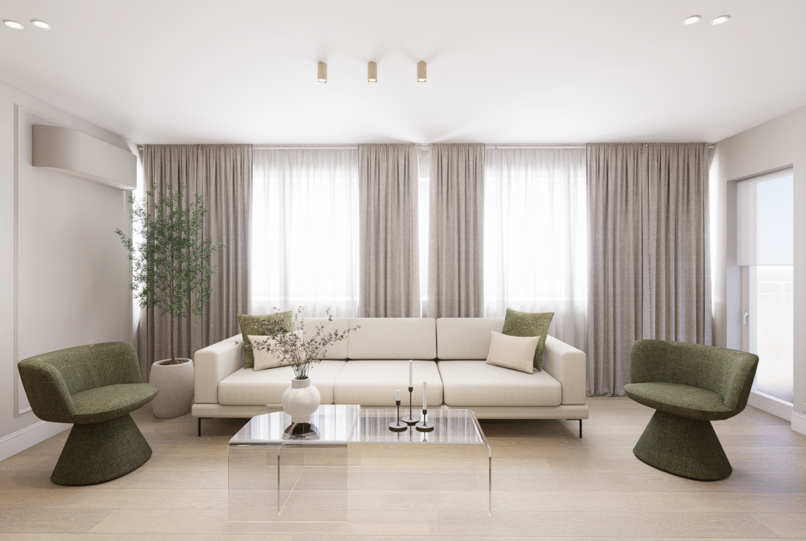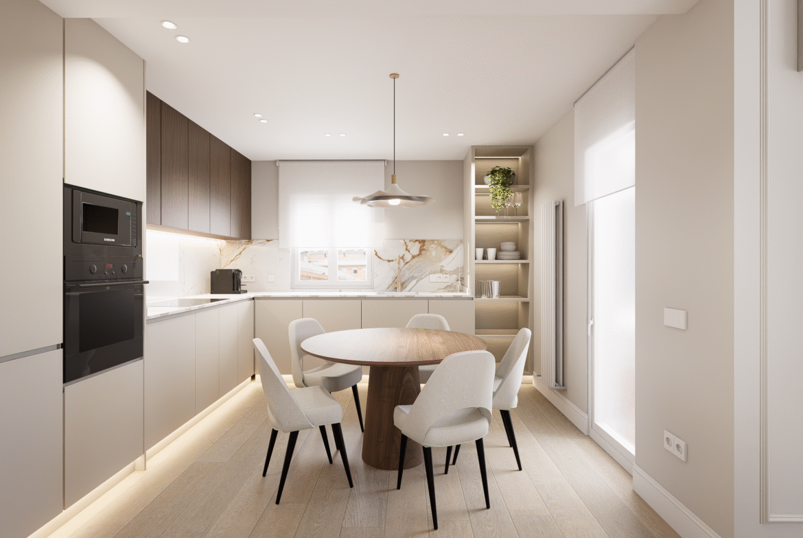 Al entrar, un salón bañado por luz natural gracias a su altura domina el espacio. Desde él se accede a dos balcones exteriores, una prolongación natural de la vivienda hacia el cielo de Madrid. La cocina, equipada y diseñada para el uso cotidiano, se integra de forma equilibrada con el resto del espacio.