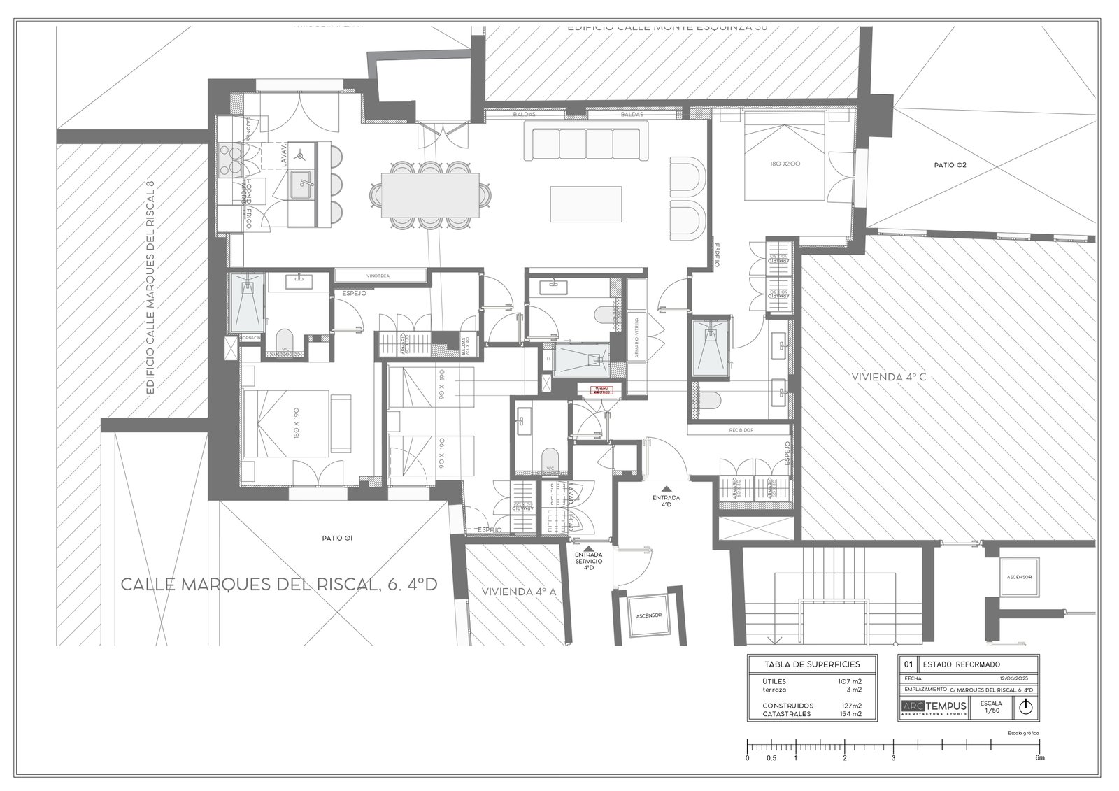 Ubicado en Marqués del Riscal 6, este cuarto piso exterior ha sido completamente transformado por ArcTempus, combinando un diseño contemporáneo con la esencia clásica de la arquitectura madrileña.