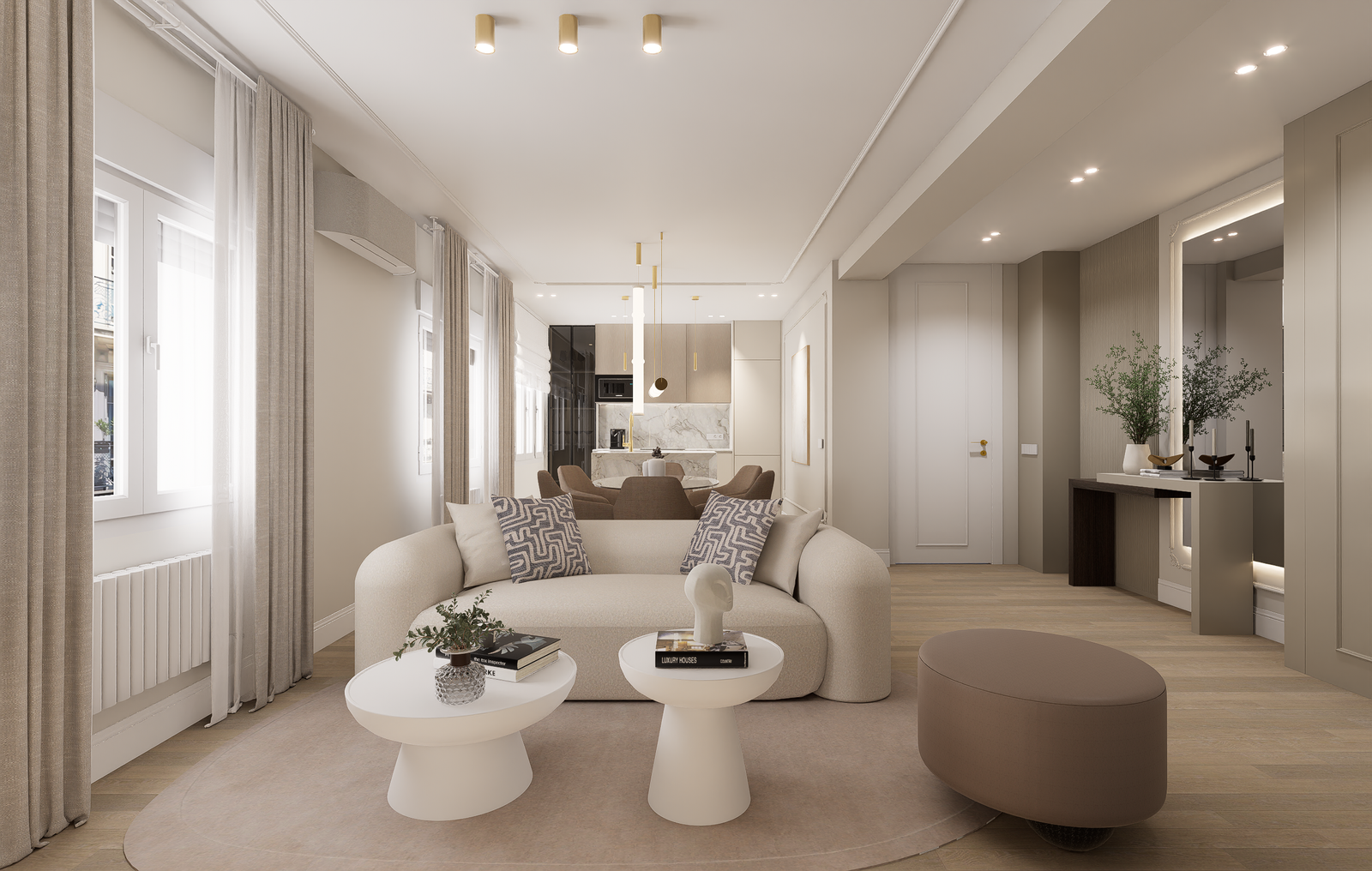 Los interiores siguen el lenguaje estético de ArcTempus: materiales nobles, carpintería de suelo a techo, iluminación integrada y una paleta neutra que transmite calma y sofisticación.