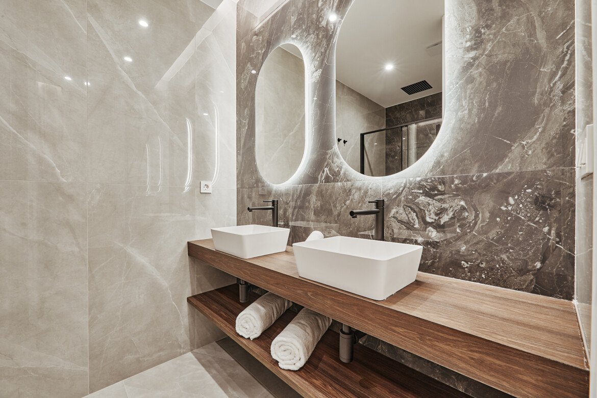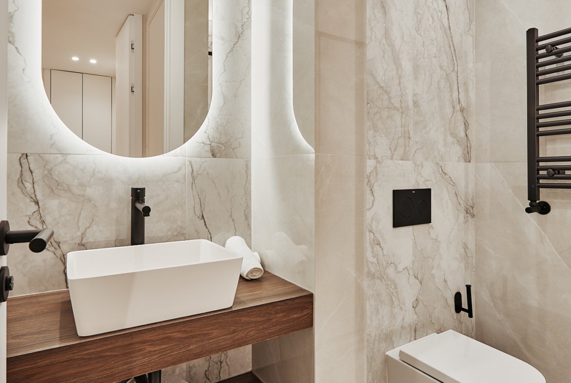 La carpintería de suelo a techo, los baños con piezas de Porcelanosa y la cocina totalmente equipada con electrodomésticos de última generación definen un espacio contemporáneo y eficiente.